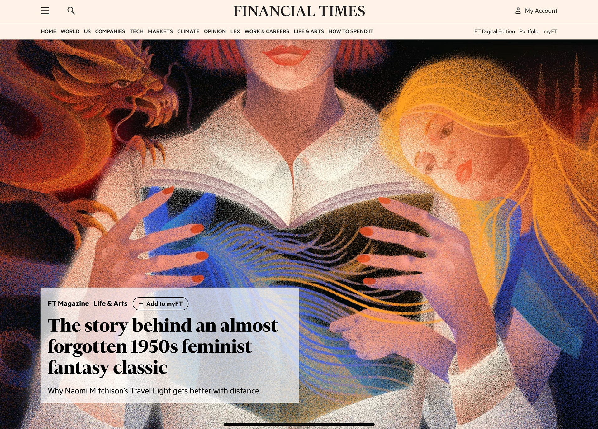 Editorial illustration for FT Weekend Magazine accompanying the Life & Arts section essay "The story behind an almost forgotten 1950s feminist fantasy classic".